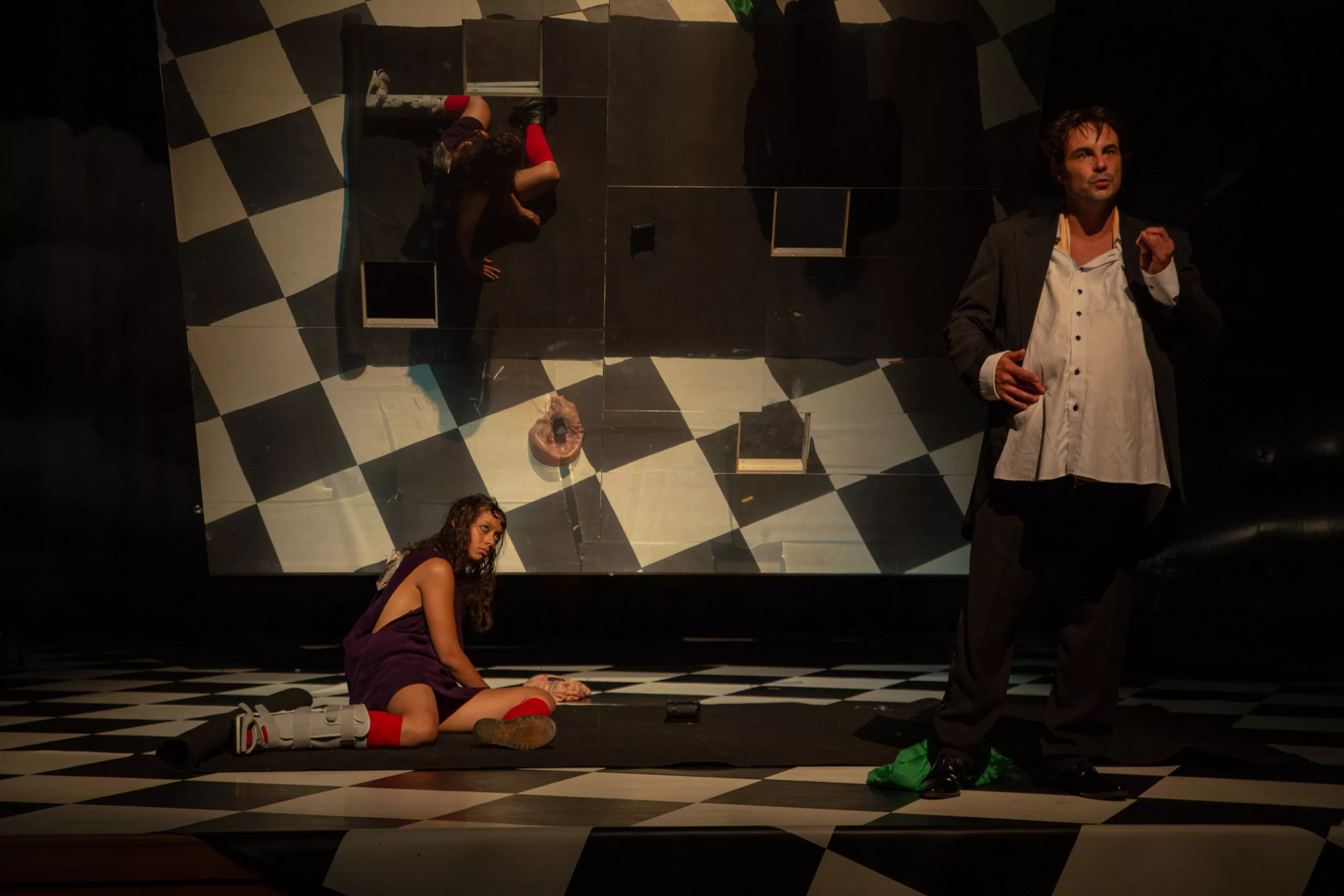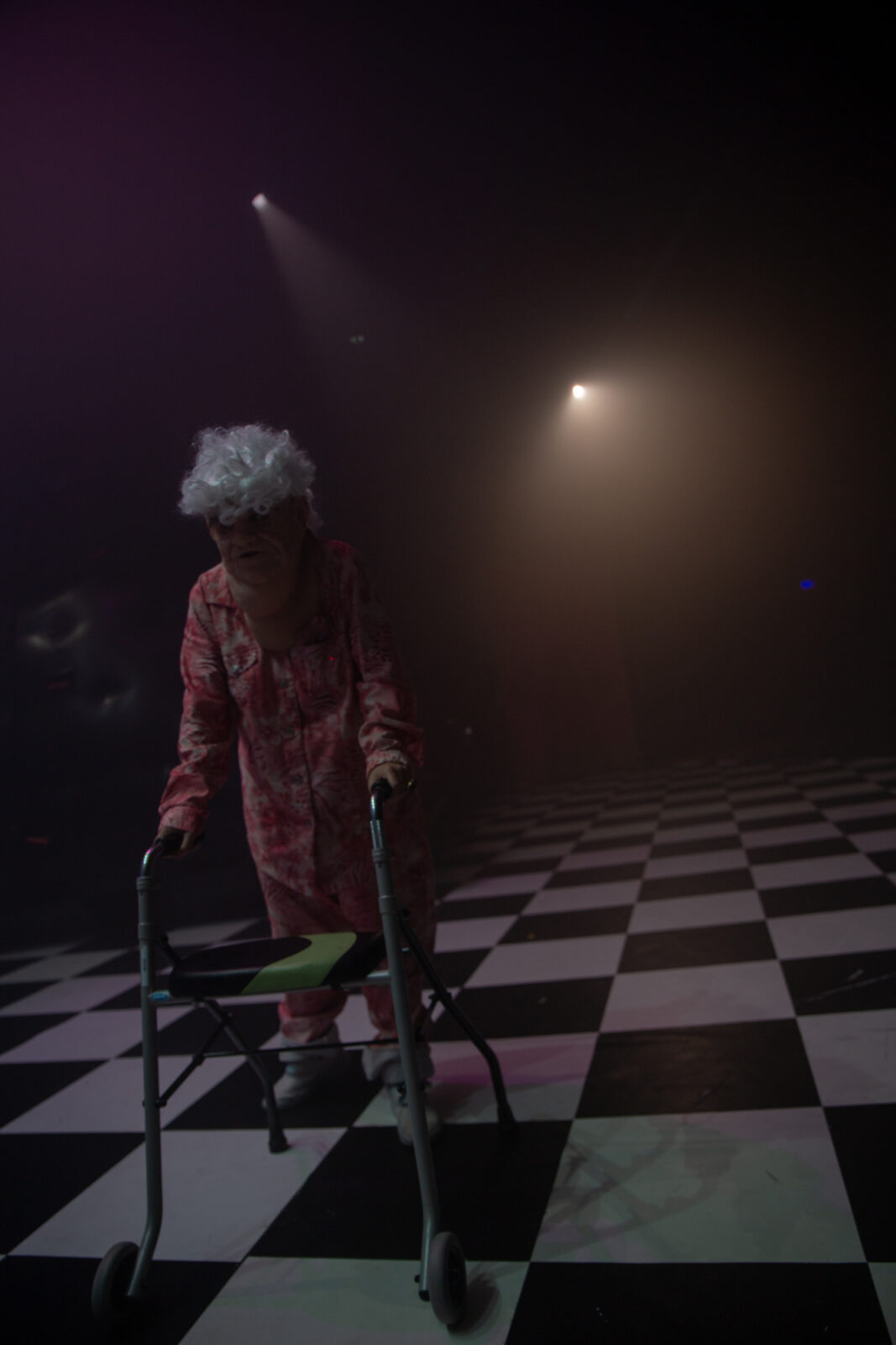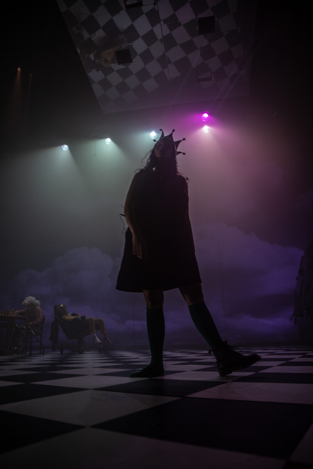 Nous avons alors choisi de bâtir une variation autour du texte de Lewis Carroll. Écriture de plateau délicate, cherchant à déstabiliser quelque chose au cœur d’un modèle de la littérature enfantine – modèle qui s’impose lorsque nous pensons à Alice. Par glissements échiquéens successifs, Alice va rencontrer six vieux tirant vers le monstrueux, qui lui livreront un trousseau de clefs ambiguës pour des portes qu’elle seule pourra ouvrir. Six vieux missionnés pour faire perdre à Alice la sensation de la personne qu’elle est.